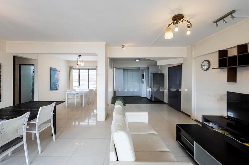 Step into a bright and airy sanctuary at Laguna Park, where abundant natural light floods the spacious living area through large windows, offering unblocked views of the city skyline and lush greenery. The modern minimalist interior, complemented by white tiled flooring and wall-mounted shelving, creates an inviting atmosphere that is both stylish and functional.
