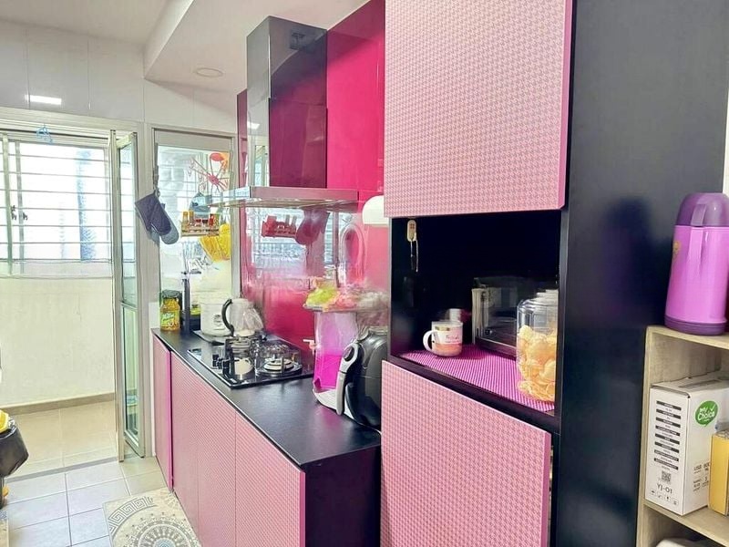 This unit boasts a practical layout with three comfortable bedrooms, each equipped with ceiling fans and built-in wardrobes for ample storage. The master bedroom features a queen-sized bed and a chic grey accent wall, while the versatile study can easily serve as an additional bedroom. The kitchen is a culinary delight, complete with a gas hob and frosted glass cabinet doors, perfect for both cooking and entertaining.