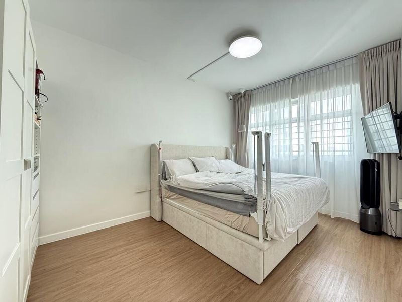 Step into a beautifully renovated HDB flat that radiates warmth and style. The abundant natural light floods the open living space, accentuating the sleek wood flooring and creating an inviting atmosphere. The modern kitchen, featuring two-tone cabinetry and a striking black double-door fridge, seamlessly connects to the living area, making it perfect for entertaining.