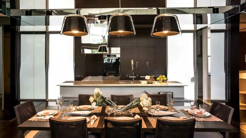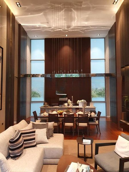 Step into a world of modern elegance as you enter this stunning duplex penthouse at The Oliv. The abundant natural light floods the open-concept living and dining area, accentuating the double-volume high ceilings and dark wood flooring. Floor-to-ceiling windows frame picturesque views of lush greenery and neighboring residential buildings, creating a serene ambiance that invites relaxation.