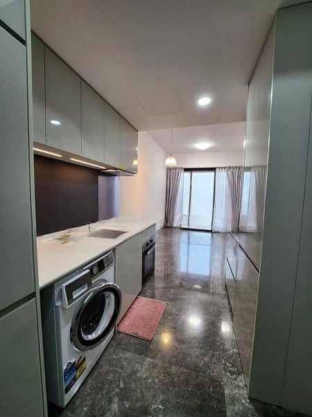 This thoughtfully designed 2-bedroom unit boasts standout features including a spacious living room with built-in display shelving adorned with gold accents, a kitchen equipped with white marble countertops and integrated appliances, and a luxurious arrival court with a grand cantilevered canopy and water feature. Enjoy exclusive access to extensive lifestyle facilities, including an infinity edge pool and hydrotherapy pool, ensuring relaxation and leisure at your fingertips.
