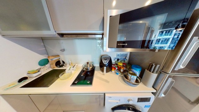 This well-maintained unit features an open-concept layout, seamlessly connecting the living, dining, and kitchen areas. The fully-furnished kitchen boasts integrated appliances, including an induction hob and microwave, complemented by sleek white countertops. Enjoy the luxury of a private balcony with outdoor seating, perfect for soaking in the coastal views. The infinity-edge pool and glass-enclosed gym further elevate your lifestyle, providing both relaxation and fitness options right at your doorstep.