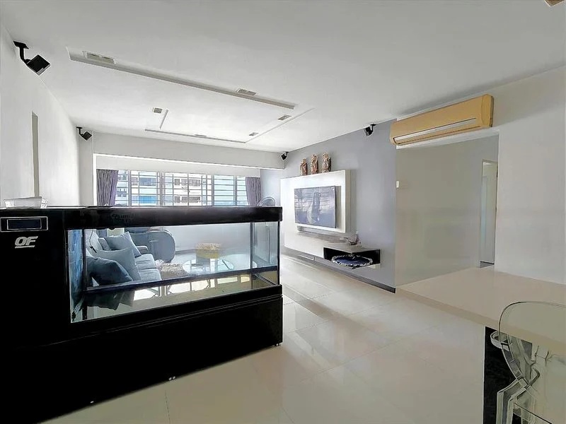 Step into a world of serenity as you enter this beautifully renovated HDB flat, where abundant natural light floods the space, highlighting the modern minimalist finishes. The unblocked panoramic water views from the large windows create a tranquil ambiance, perfect for unwinding after a long day. The living room, adorned with white polished tile flooring and a striking grey accent wall, features a stunning built-in aquarium that adds a unique touch to your home.