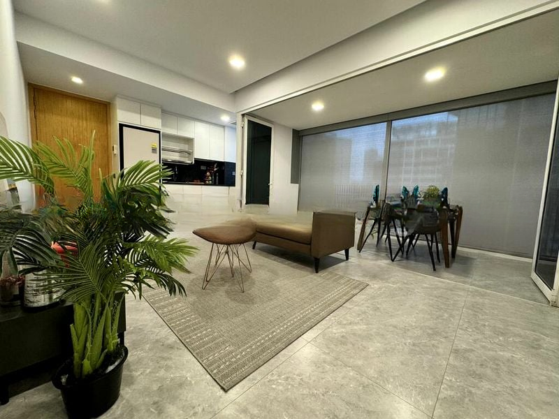 Step into a world of modern elegance as you enter this well-maintained unit at The Peak @ Cairnhill II. Bathed in abundant natural light, the open-concept living and dining area features sleek grey tile flooring and sliding glass doors that lead to a decked balcony, offering breathtaking views of the city skyline. The minimalist finishes create a serene ambiance, making it the perfect retreat from the bustling city.