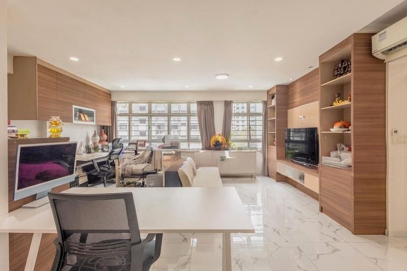 This thoughtfully renovated 3-bedroom flat features a standout kitchen equipped with built-in appliances, perfect for culinary enthusiasts. The spacious living room is designed for comfort, showcasing black leather recliners and a display cabinet, while the master bedroom boasts a large sliding wardrobe with a luxurious marble-effect finish. Each room is adorned with modern fixtures, ensuring a stylish yet functional living experience.
