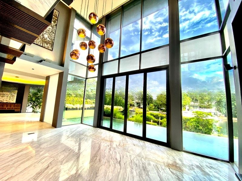 Step into a world of luxury as you enter this exquisite home, where abundant natural light floods through floor-to-ceiling glass walls, illuminating the elegant marble flooring and designer finishes. The double-height ceilings create an airy ambiance, while the stunning views of the pool and lush greenery provide a serene backdrop for everyday living.