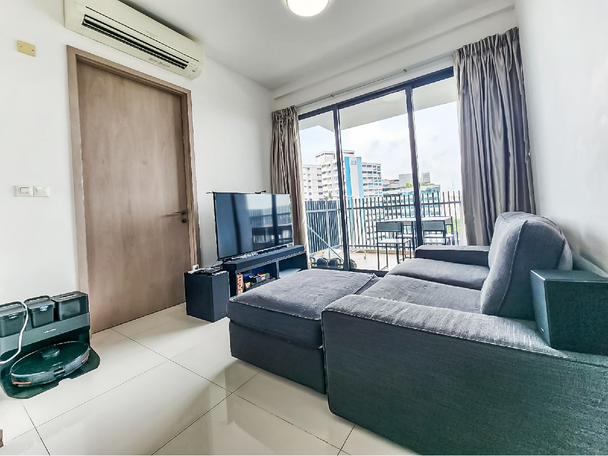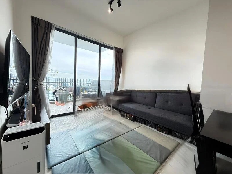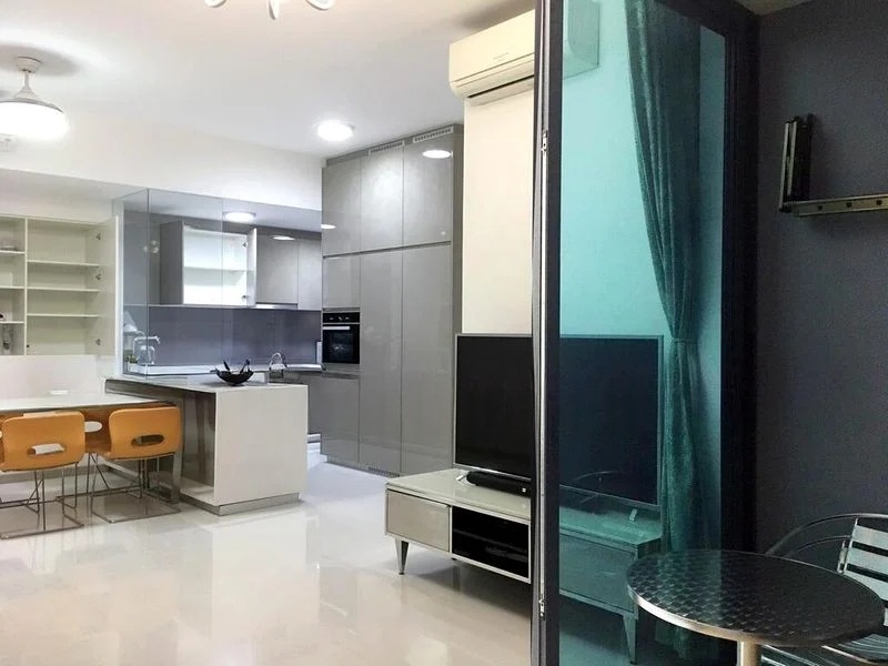 Step into a world of modern elegance as you enter this beautifully renovated 3-bedroom unit at J Gateway. The open concept living space is bathed in natural light, showcasing white glossy floor tiles that reflect the contemporary ambiance. The glass partition wall adds a touch of sophistication, while the large framed artwork and plush blue fabric sofa create an inviting atmosphere perfect for relaxation.