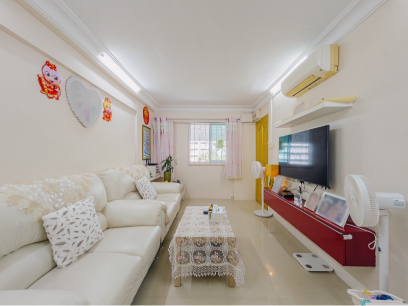 Step into this well-maintained HDB flat and be greeted by a bright and functional ambiance, enhanced by moderate natural light filtering through the windows. The living room features elegant white tiled flooring and a striking red floating TV console, creating a welcoming atmosphere. Enjoy views of lush greenery and neighboring blocks, making this space feel serene and connected to nature.