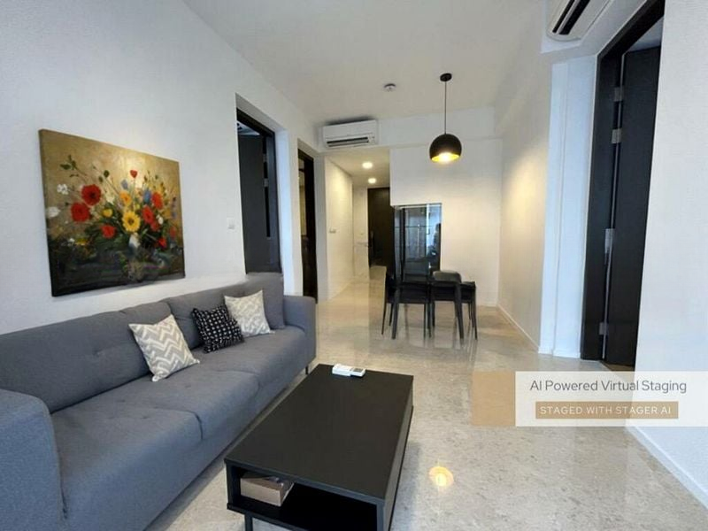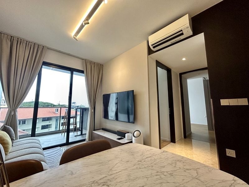 Step into this beautifully renovated 2-bedroom unit at Avenue South Residence, where modern minimalist design meets abundant natural light. The marble-look floor tiles and floor-to-ceiling windows create a bright and airy ambiance, offering breathtaking views of the city skyline and lush greenery beyond. The open-concept living and dining area, adorned with sheer curtains, invites you to unwind in style.