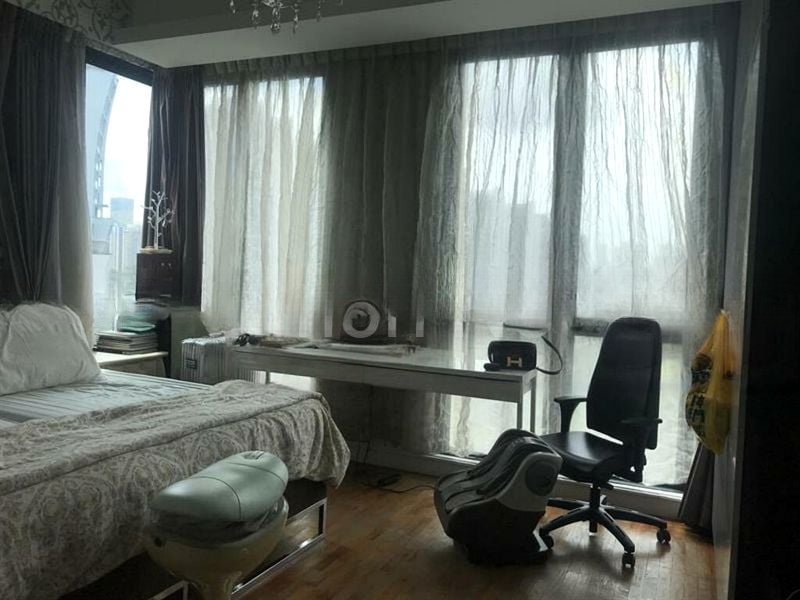 Step into a bright and airy sanctuary at Tanglin View, where abundant natural light floods through large corner windows, creating an inviting atmosphere. The elegant wood parquet flooring complements the marble finishes in the bathrooms, while the views of lush greenery and urban buildings provide a serene backdrop.