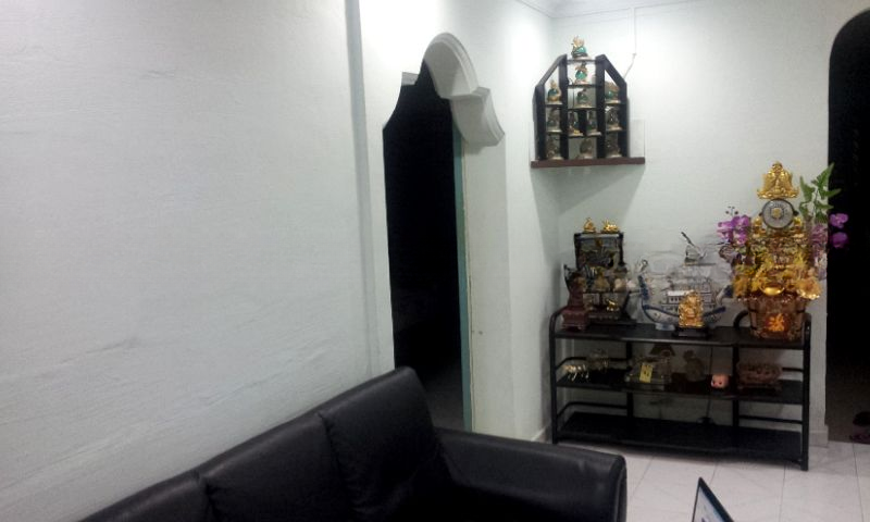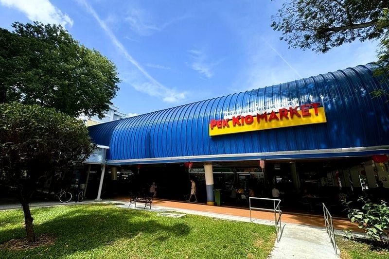 Step into a bright and airy sanctuary where abundant natural light floods through large windows, illuminating the well-maintained interiors. The distinctive blue curved roof of Pek Kio Market and the vibrant yellow facade of HDB Block 44 create a charming backdrop, complemented by landscaped greenery and mature trees that enhance the serene ambiance.