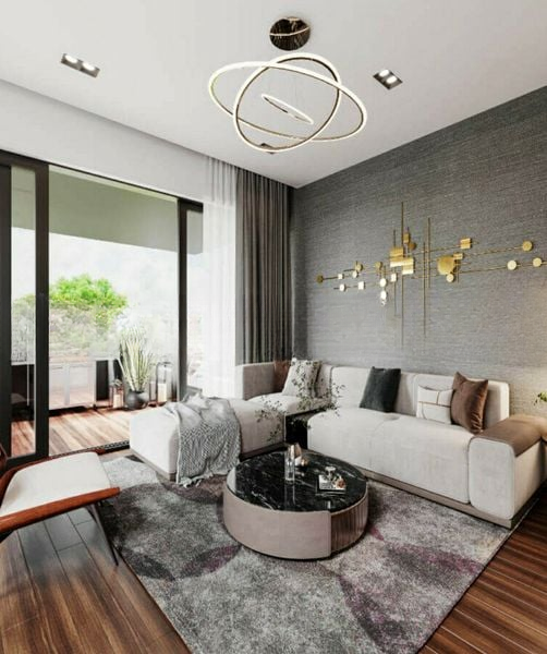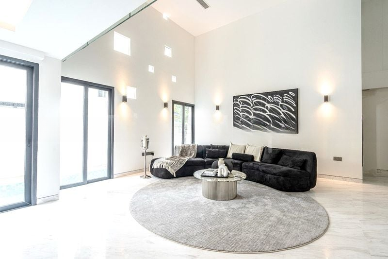 Step into a realm of modern luxury where abundant natural light dances across high ceilings and exquisite marble finishes. The designer renovation showcases a seamless blend of elegance and comfort, highlighted by stunning views of lush greenery and the inviting pool from your private patio. Every corner of this brand-new home radiates sophistication, from the geometric gold chandeliers to the plush furnishings that invite relaxation.