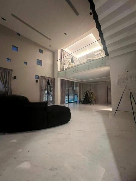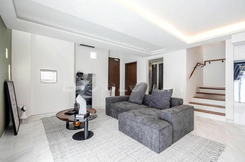 This exceptional unit features six spacious bedrooms, each with en-suite bathrooms, ensuring privacy and convenience for all. The heart of the home, a U-shaped kitchen, boasts black granite countertops and integrated appliances, perfect for culinary enthusiasts. The living and dining areas are designed for entertaining, with a marble dining table and a modern staircase that adds a striking architectural element to the space.