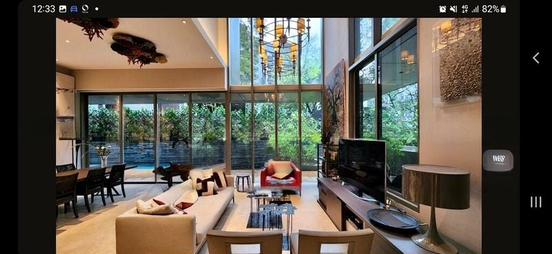 Step into a world of modern luxury as you enter this beautifully designed unit at Leedon Residence. The abundant natural light floods through the floor-to-ceiling glass walls, illuminating the open-concept living area adorned with a stunning designer chandelier and a striking red leather accent chair. Enjoy serene views of the lush greenery and the inviting private lap pool, creating a tranquil ambiance that feels both luxurious and welcoming.