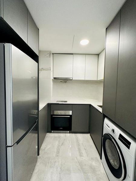 This thoughtfully designed 1-bedroom unit features a spacious living area with sliding glass doors, a contemporary kitchen equipped with integrated appliances, and a luxurious en-suite bathroom complete with a rain shower and floating vanity. The bedroom boasts wood-look laminate flooring and built-in sliding wardrobes, ensuring both style and functionality.