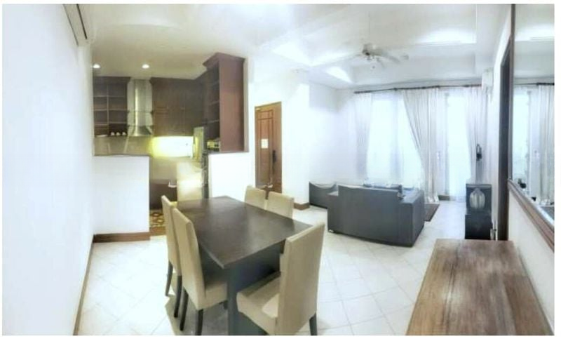 This well-maintained 4-bedroom unit features a spacious living room perfect for relaxation, complemented by a dining area adorned with a striking large wall-mounted mirror. The kitchen is a chef's delight, equipped with dark wood shaker-style cabinets, black stone countertops, and modern appliances including a built-in oven. Enjoy your fitness routine in the home gym, or unwind by the lap pool surrounded by landscaped gardens.