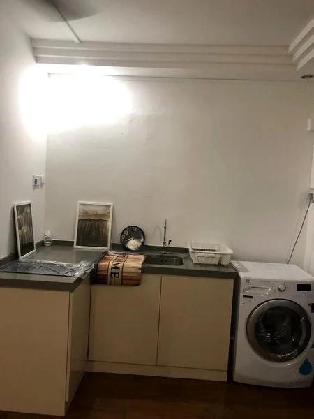 Step into this bright and airy 1-bedroom flat, where the natural light dances through the white sheer curtains, illuminating the minimalist finishes. The unblocked greenery view from the window creates a serene ambiance, complemented by the well-maintained interiors featuring a ceiling fan and ample built-in storage.