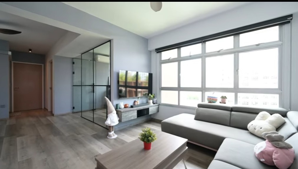 Step into this beautifully renovated 3-bedroom flat, where modern minimalism meets abundant natural light. The spacious living room greets you with large windows framing serene views of the surrounding greenery and park. The light wood-look flooring enhances the airy ambiance, complemented by a stylish L-shaped sofa and a sleek wall-mounted TV console, creating a perfect space for relaxation and entertainment.
