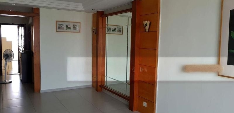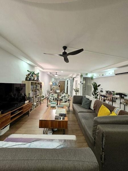 Step into this expansive 137sqm HDB flat and feel the potential of its unique fan-shaped layout. The open-plan living and dining area, adorned with white tiled flooring and ceiling fans, invites natural light to dance across the space, creating a warm and welcoming ambiance. Enjoy serene views of lush greenery and the courtyard, making every moment spent here a tranquil escape.
