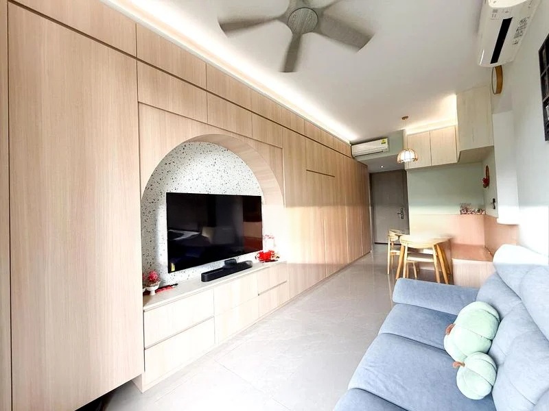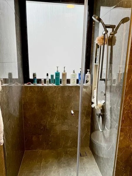 This thoughtfully designed 2-bedroom, 2-bathroom unit features standout elements such as an integrated kitchen with high-end appliances, a luxurious rain shower in the bathroom, and built-in wardrobes that maximize storage. The living area is equipped with a ceiling fan and split-unit air conditioning for comfort, while the balcony's glass railing enhances the view and outdoor experience.