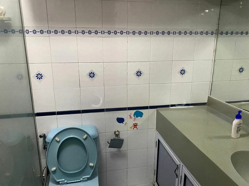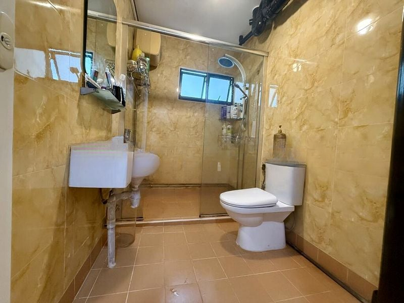Step into this bright and spacious 3-bedroom flat, where the unique curved layout immediately captivates. The open-plan living and dining area, adorned with white tiled flooring and elegant chandelier lighting, invites natural light to dance across the space, creating a warm and welcoming ambiance. Enjoy views of lush greenery and nearby HDB buildings from the enclosed balcony, featuring a stylish glass block wall and blue-tinted sliding doors that enhance the overall aesthetic.