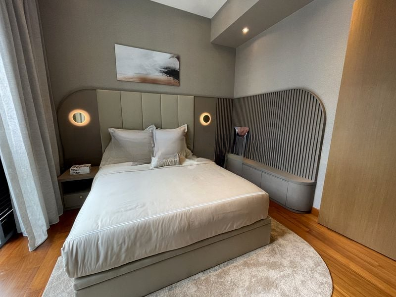 This exquisite 5-bedroom unit boasts standout features including a spacious living room with direct pool access, a modern kitchen equipped with dark wood cabinetry and unique overhead glass shelving, and a master bedroom that showcases a designer slatted headboard with integrated lighting. The thoughtful layout ensures that every room feels connected yet private, with high-quality finishes that elevate the living experience.