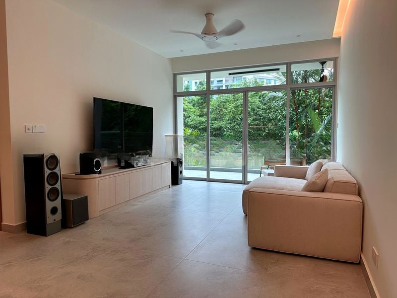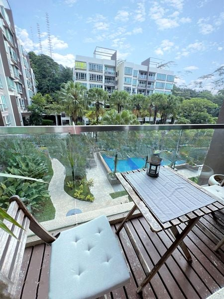 Step into a bright and airy sanctuary at The Raintree, where abundant natural light floods the spacious living room, accentuated by sheer curtains and a seamless flow to the balcony. Enjoy stunning views of the pool and lush greenery, creating a serene ambiance that invites relaxation.