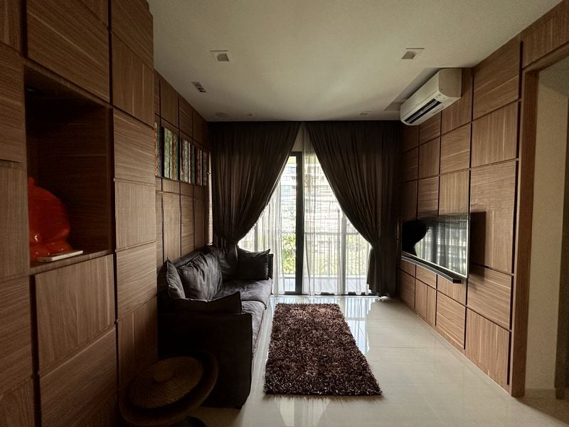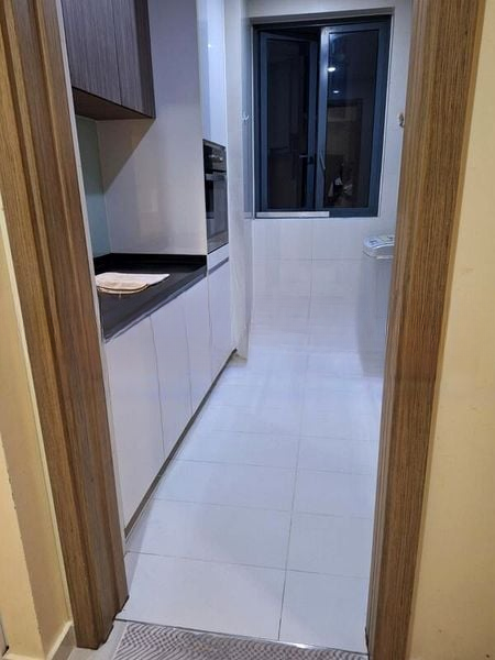 This well-maintained unit boasts a seamless layout, featuring a stylish marble-top dining table that integrates effortlessly with the living space. The master bedroom is a serene retreat with patterned wallpaper, a bay window with cushions, and a ceiling fan for added comfort. The second bedroom is thoughtfully designed with an integrated study desk and built-in storage bed, catering to both relaxation and productivity. The galley kitchen is equipped with modern black countertops and dual-tone cabinetry, making it a joy to cook in.