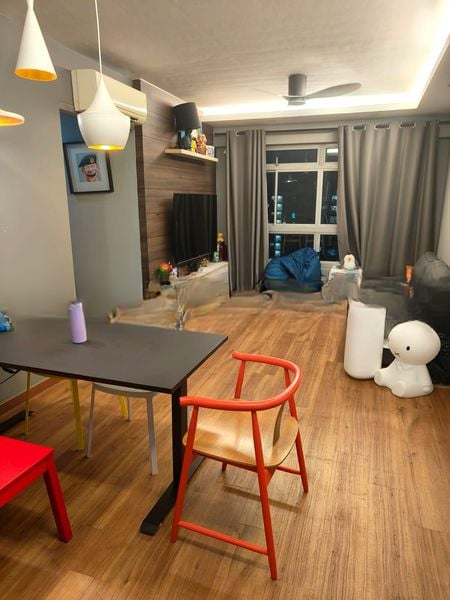 Step into this beautifully maintained 3-bedroom flat and be greeted by an abundance of natural light streaming through large windows, illuminating the open concept living and dining areas. The bright ambiance is complemented by modern finishes, including a stylish false ceiling with recessed lighting and a vibrant kitchen featuring yellow accents that add a cheerful touch to your culinary adventures.