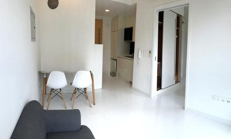 This well-maintained 1-bedroom unit features a fully-furnished interior with standout elements such as a rain shower in the bathroom, an induction hob in the sleek open-concept kitchen, and a built-in wardrobe that maximizes space. The living area, adorned with pendant lighting and a compact sofa, seamlessly connects to the kitchen, creating a functional yet cozy environment.