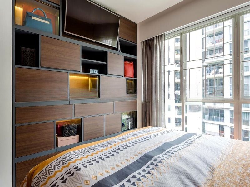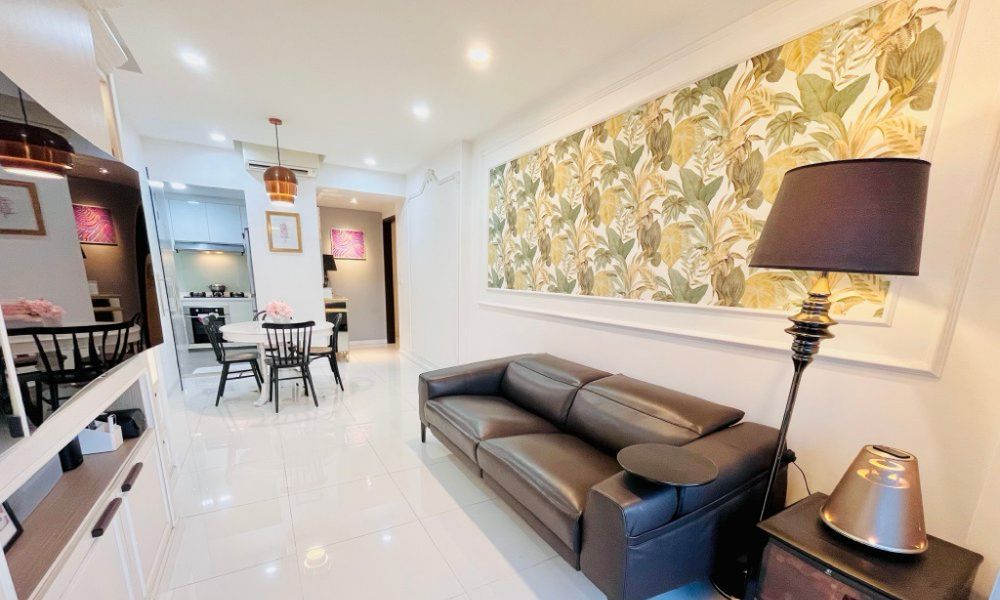 Step into this beautifully renovated 3-bedroom unit at Heron Bay, where modern finishes meet functional elegance. The polished tile flooring and geometric accent wall in the living room create a striking first impression, while large windows invite natural light and frame serene views of lush greenery from the balcony.