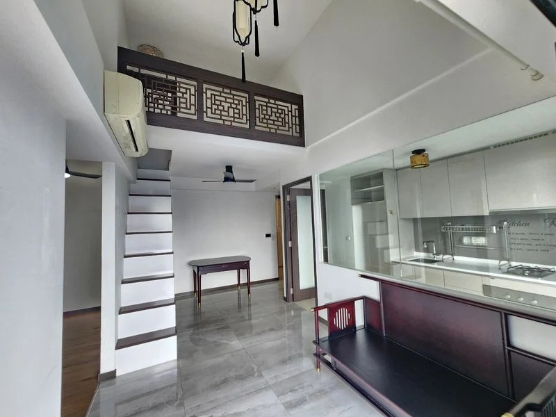 This well-maintained unit features a thoughtful layout with standout elements such as a loft mezzanine, perfect for a cozy reading nook or home office. The glass-walled kitchen boasts minimalist white cabinetry, a built-in oven, and a gas hob, seamlessly connecting to the living area. The master bedroom offers a peaceful retreat with wood-look laminate flooring, a built-in wardrobe, and large windows that invite the outdoors in. The luxurious bathroom features a walk-in rain shower and a floating vanity cabinet, enhancing the modern living experience.