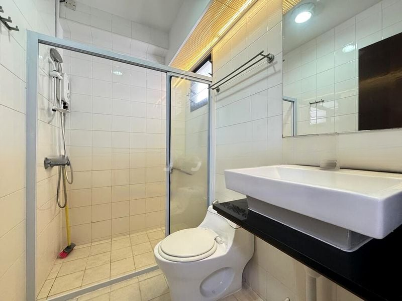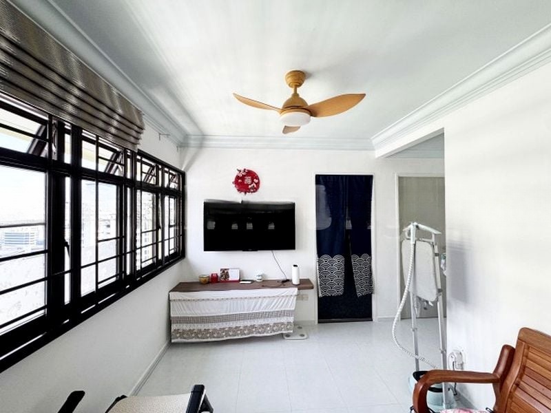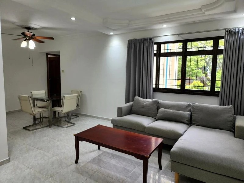 Step into this beautifully renovated HDB flat, where a bright and airy ambiance greets you. The glossy kitchen cabinetry and white countertops create a modern feel, while large windows invite natural light and showcase serene greenery views. The living area, adorned with recessed ceiling lights and a stylish L-shaped sofa, offers a perfect space for relaxation and gatherings.