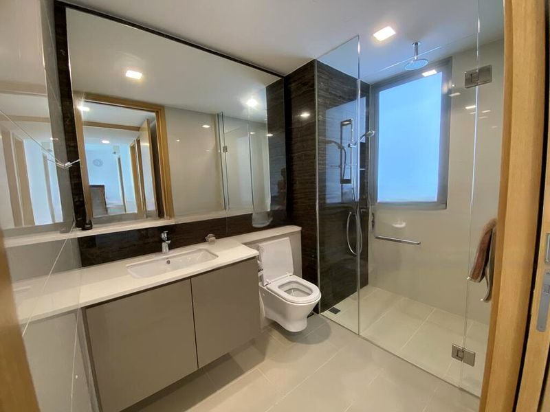 This well-maintained 2-bedroom, 2-bathroom unit boasts standout features including a stylish island kitchen with a white countertop and dark grey cabinetry, complemented by a stunning marble-look backsplash. The living room, adorned with floor-to-ceiling balcony doors, seamlessly connects indoor and outdoor living. Each bedroom is designed for comfort, featuring wooden flooring and large windows that enhance the airy feel of the space. The bathrooms are a testament to modern design, featuring glass shower enclosures and wall-hung toilets for a sleek finish.
