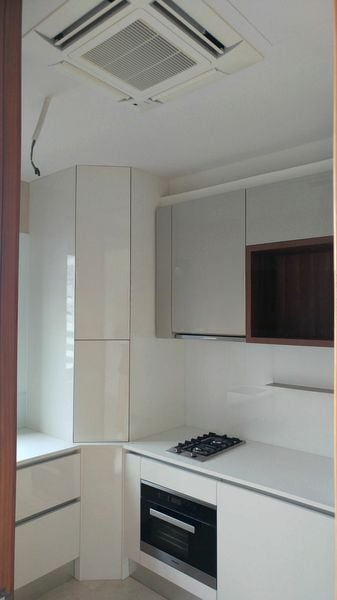 This well-maintained 3-bedroom unit boasts a thoughtful layout, featuring a spacious open-concept living and dining area that seamlessly connects to a modern U-shaped kitchen equipped with glossy grey and white cabinets and integrated appliances. The master bedroom offers a platform bed with convenient storage, while the common bedroom maintains the same minimalist charm with wooden flooring and a large window. Each room is designed to maximize comfort and style, making it an ideal sanctuary for relaxation.