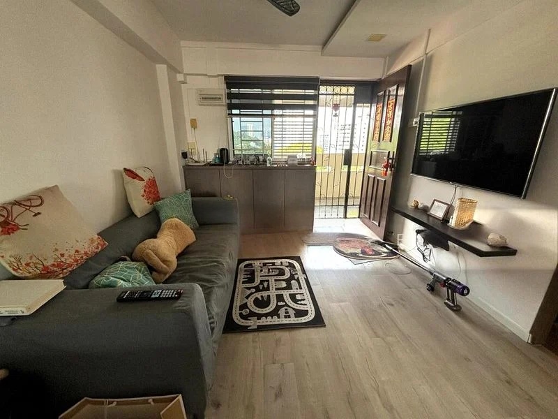 Step into a bright and airy 3-room flat at 42 Telok Blangah Rise, where the spacious living room greets you with a charming ornate ceiling light fixture and a large window framing serene greenery views. The moderate natural light enhances the tiled flooring throughout, creating a welcoming ambiance that invites relaxation.