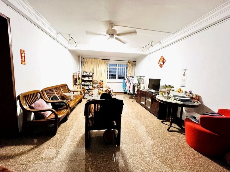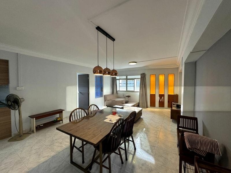 Step into this beautifully maintained HDB flat and be welcomed by an abundance of natural light that fills the spacious open-plan living and dining area. The modern copper-finish pendant lights and consistent tiled flooring create a bright and airy ambiance, while large windows offer delightful views of the neighboring residential blocks.