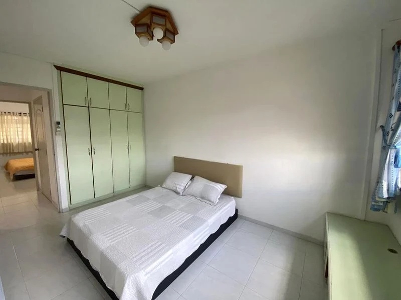 This well-designed unit features three comfortable bedrooms, including a master with a striking purple accent wall and a tufted headboard bed. The standout bathroom showcases patterned Peranakan-style tiles, complemented by modern fixtures and a glass shower screen. With a large blue built-in wardrobe in the second bedroom and an inviting L-shaped sofa in the living area, this home is perfect for both relaxation and entertaining.