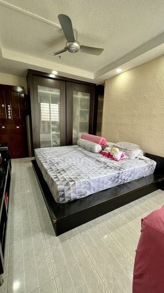 Step into this beautifully renovated HDB flat and feel the warmth of its cozy ambiance. The living room greets you with a built-in storage wall, elegant glass display cabinets, and a charming window bench seat that invites natural light to dance across the space. Decorative pendant lighting adds a touch of sophistication, creating an inviting atmosphere for relaxation and entertaining.