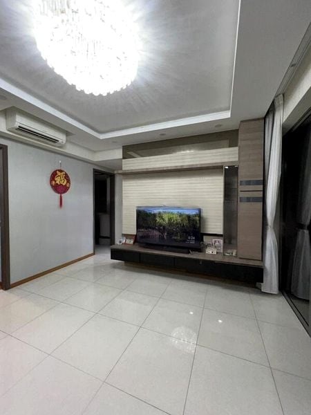 Step into a modern oasis where elegance meets functionality. The spacious living room greets you with large format floor tiles and a striking crystal chandelier, complemented by recessed lighting that enhances the ambiance. Enjoy the seamless flow into the open-concept dining area adorned with artistic wall decor, creating a perfect setting for gatherings. The balcony access invites natural light, offering serene views that elevate your living experience.