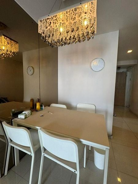 This well-maintained unit boasts a modern galley kitchen equipped with a gas hob and sleek cabinetry, ideal for culinary enthusiasts. The living room features a stylish L-shaped teal sofa, while the dining area showcases a contemporary geometric chandelier above a glass-top dining table. The master bedroom is designed for comfort with a custom platform bed that includes integrated storage, ensuring a clutter-free environment.