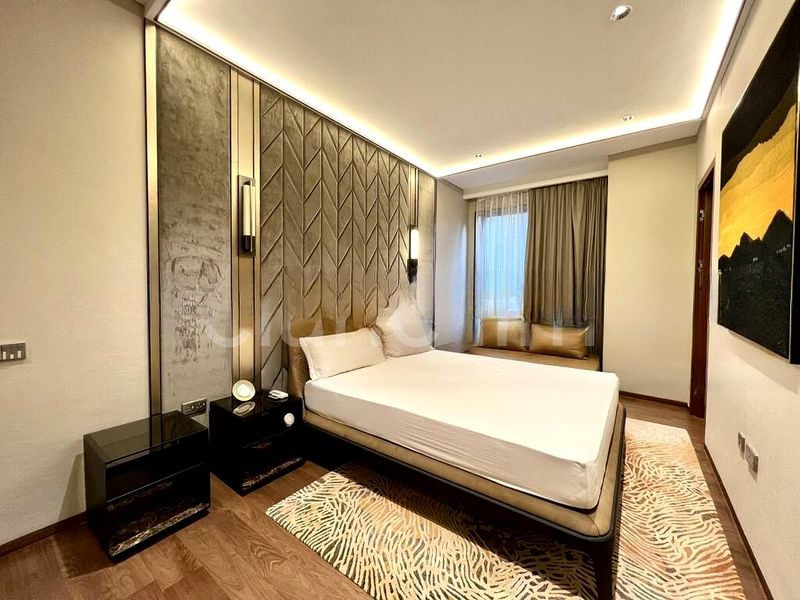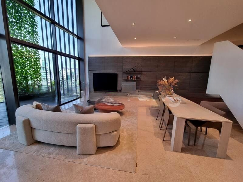 Step into a realm of modern elegance as you enter this exquisite unit at 3 Orchard By-The-Park. Bathed in abundant natural light, the double-volume high ceiling and floor-to-ceiling windows create an airy ambiance, while the sleek marble flooring and designer furnishings invite you to unwind in style. The vertical wood slat feature wall adds a touch of sophistication, framing the breathtaking views of the city skyline and lush greenery.