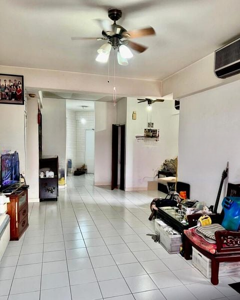 Step into this inviting 2-bedroom unit at Bayshore Park, where the charm of original herringbone parquet flooring meets the practicality of a spacious layout. Natural light filters through the living room, highlighting the white tiled flooring and the functional ambiance that makes this space feel like home. Enjoy views of the surrounding greenery and urban landscape from the comfort of your living area.