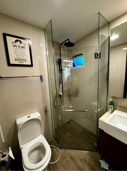 This thoughtfully designed unit features a compact yet efficient layout, boasting a contemporary kitchenette with sleek white countertops and ample built-in storage. The bedroom is equipped with twin single beds and a sliding door wardrobe, while the bathroom showcases a glass shower enclosure and modern vanity, perfect for relaxation. Additional highlights include built-in floor-to-ceiling wardrobes, split-unit air conditioning, and a ceiling fan, ensuring comfort throughout.