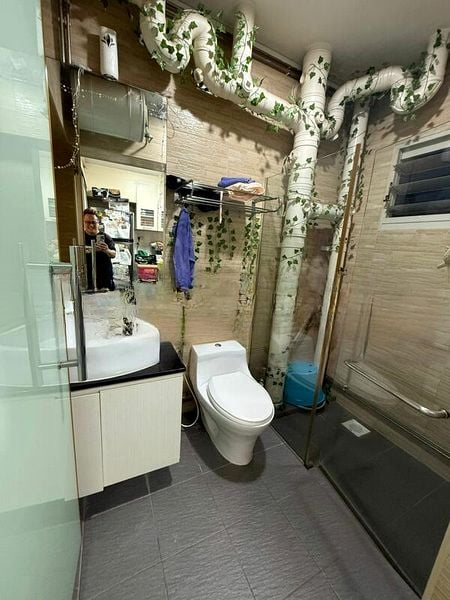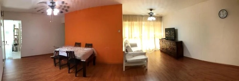 Step into this inviting 5-room flat at Edgedale Plains, where a cozy and warm ambiance greets you. The living room, adorned with wood-look laminate flooring and large windows draped with sheer curtains, invites natural light to dance across the space. The intricate carvings of the large wooden TV console and the vibrant orange accent wall in the dining area create a charming focal point, making it a perfect setting for relaxation and gatherings.