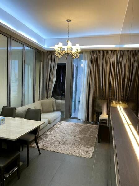 This well-maintained 1-bedroom unit boasts a space-saving murphy bed and extensive storage cabinets, ensuring functionality without compromising on style. The designer kitchen, separated by a glass partition, is equipped with high-end appliances, including an induction cooktop and built-in oven, perfect for culinary enthusiasts. The marble-top dining table, complemented by elegant pendant lights, sets the stage for intimate gatherings.