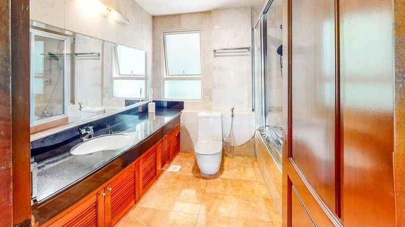 This well-maintained unit features an open-concept layout, ideal for both entertaining and family living. The living room boasts a ceiling fan and air conditioning, while the dining area is perfect for gatherings. Each of the four bedrooms, adorned with parquet wood flooring, provides direct access to the balcony, ensuring a seamless indoor-outdoor experience. The bathrooms are elegantly designed with marble-look tiles and a luxurious bathtub, adding a touch of sophistication to your daily routine.