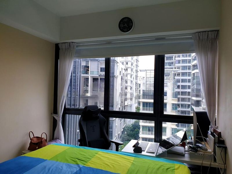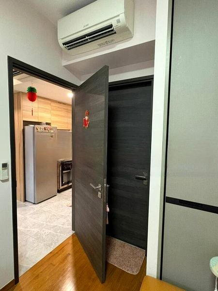 This thoughtfully renovated unit boasts an integrated LG washing machine and built-in oven, perfectly complementing the modern wood-grain cabinetry in the kitchen. The spacious bedroom features large windows that frame the cityscape, while the integrated study area provides a functional touch. With track lighting enhancing the ambiance, this home is both stylish and practical.