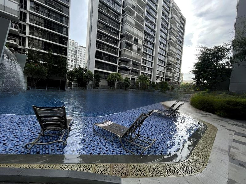 Step into this beautifully maintained unit at Twin Waterfalls and be greeted by an abundance of natural light streaming through the floor-to-ceiling windows. The modern minimalist design creates a serene ambiance, complemented by views of the lush greenery and the inviting swimming pool, complete with a soothing waterfall feature.