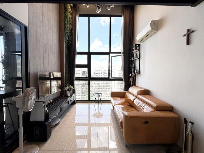 Step into a world of modern elegance as you enter this beautifully designed unit at Lush Acres. The abundant natural light floods the space through floor-to-ceiling windows, illuminating the polished tile flooring and highlighting the sophisticated ambiance. The double-volume high ceiling in the living room creates an airy feel, while the custom under-stairs shelving and the striking wood-beam ceiling detail add a unique touch to the overall aesthetic.